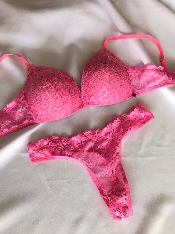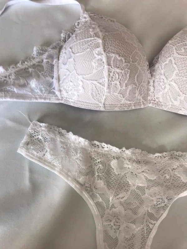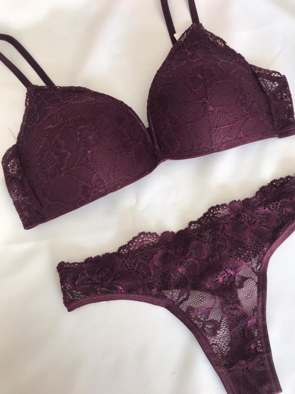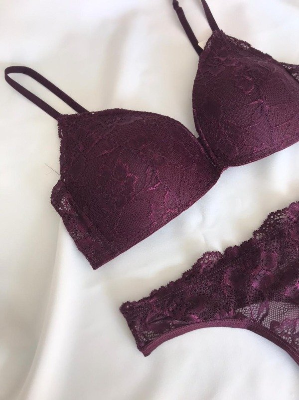 Conjunto de puntilla. Corpiño triangulito taza soft sin push up y cola less.
