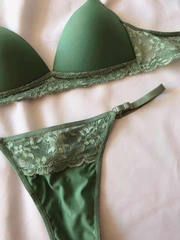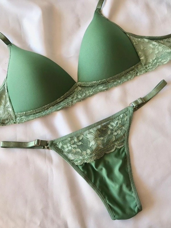 Conjunto de microfibra y puntilla. Corpiño triángulo soft sin Push up. Tangaless regulable.