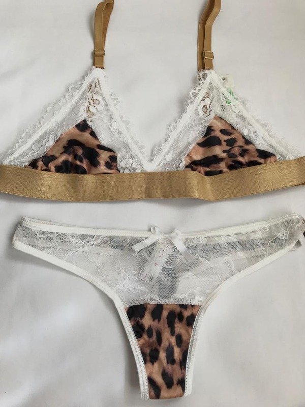 Conjunto Bralette de microfibra sublimada Print con puntilla eyelash con elastico dorado y colaless clasica